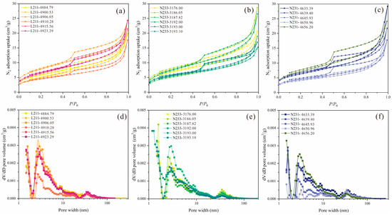 N2 adsorption curves and PV distribution characteristics of three wells (L11, N33, and N31). (a) DBWD for N2 adsorption; (b) LBWD for N2 adsorption; (c) DBSD for N2 adsorption; (d) DBWD for dV/dD meso-macropore volume; (e) LBWD for dV/dD meso-macropore volume; (f) DBSD for dV/dD meso-macropore volume.