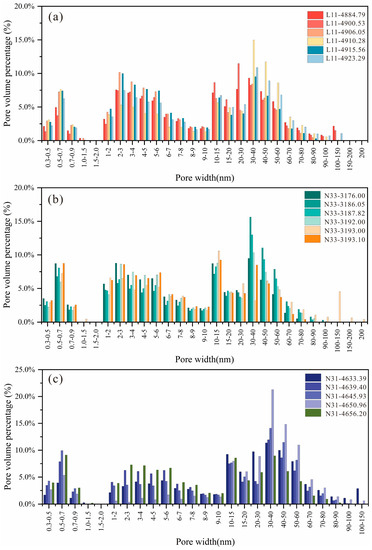 As can be seen from Figure 7a, the PSD of the shale samples from the lower quality section of the Longmaxi Formation is consistent, with all samples showing significant bimodal peaks at 1.6 nm and 3.0 nm (Figure 7). However, due to the difference in depth of burial of different samples, the pore development in the upper is worse than that of the quality shale section at the bottom of the Longmaxi Formation, and the number of large pores with an average pore diameter greater than 50 nm is low. The experimental tests showed that the average values of SA in the samples from Wells L11, N33, and N31 were 21.2161 m2/g, 21.9987 m2/g, and 19.7632 m2/g for meso-macropores, respectively; In contrast, the average PV values are 0.0317 cm3/g, 0.0322 cm3/g, and 0.0351 cm3/g, respectively. The micropore SA average percentage for Wells L11, N33, and N31 to the TSA was 39.91%, 41.10%, and 43.72%, which shows the dominance of micropores to TSA. The SA average percentage for Wells L11, N33, and N31 of mesopore PV to the TPV (total pore volume) was 93.14%, 92.33%, and 92.90%, indicating that the contribution of mesopore and macropore PV to the TPV is higher. The PV percentage distribution confirms that there is a similarity from the three tectonic contexts, with approximately 50% of the pores in the Longmaxi Formation being pores with pore throat diameters under the range of 10–50 nm (Figure 8). Within the same tectonic unit, there are differences of the PV at different depths.