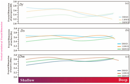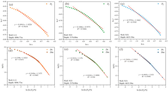 For the fractal dimension, we used two methods to calculate pore heterogeneity under different structural background conditions. CO2 adsorption is used to obtain the fractal dimension characterizing the micropores (Df); N2 adsorption is used to obtain the fractal dimension characterizing the shale mesopores, including two types: (1) fractal dimension of the surface area (Ds); (2) fractal dimension of the pore structure matrix (Dm). According to Equation (2), the sample fit formulas and correlation coefficients were calculated by plotting J(x) and x logarithmically (Figure 9). The results show that the correlation coefficient of the micropore fractal model fit is more than 0.97, indicating that the model fit is good and suitable for the characterization of the shale micropore structure [49]. The Df distribution of all samples was between 2 and 3, which was consistent with fractal theory. The Df distribution of Well L11, N33 and N31 ranged from 2.206 to 2.535, 2.254 to 2.382, 2.235 to 2.611, with an average of 2.388, 2.320 and 2.535. The Df of Well L11 decreases with increasing depth, indicating that the heterogeneity of the micropores is gradually decreasing. As the depth of burial increases, the micropores are stressed more effectively, and the pore shape tends to be uniform, indicating a reduction in micropore heterogeneity. This trend is not present in the Df distribution characteristics of the N33 well samples, suggesting that multiple factors may control micropore heterogeneity.