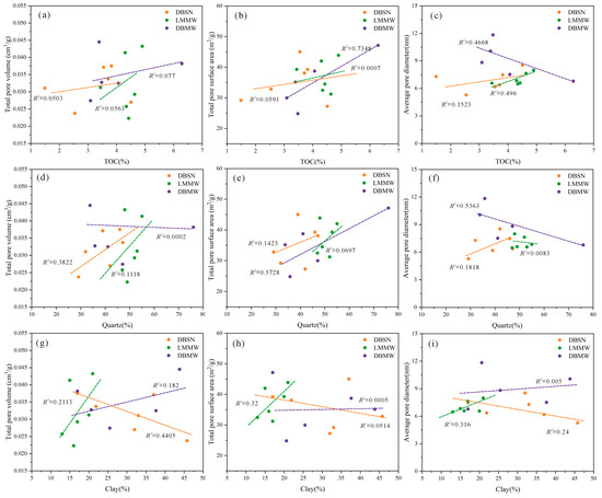 Correlation analysis of mineral composition and pore structure parameters of samples from different tectonic units. (a) relationship between TOC and Total pore volume; (b) relationship between TOC and total surface area; (c) relationship between TOC and average pore diameter; (d) relationship between quartz and total pore volume; (e) relationship between quartz and total surface area; (f) relationship between quartz and average pore diameter; (g) relationship between clay and total pore volume; (h) relationship between clay and total surface area; (i) relationship between clay and average pore diameter.