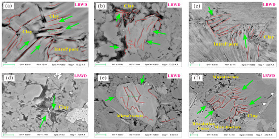 Subjected to compressive stress in the direction of the green arrow, the clay and brittle minerals show a more complex folded pattern (Figure 12). The tendency to fold or bend during tectonic deformation for clay minerals can generate pore spaces of different diameters and shapes, including high-angle faults or fractures vertical to the clay formation. The pores within the clay grains tend to be long in extension, variable in width, and regularly arranged (Figure 12a–d). Figure 12b shows that the laminated clay minerals are compressed and can easily connect to create microcracks based on the original slender intra- and interpores. If these microfractures can be related to OM, they can provide good access for shale gas transport (Figure 12d).