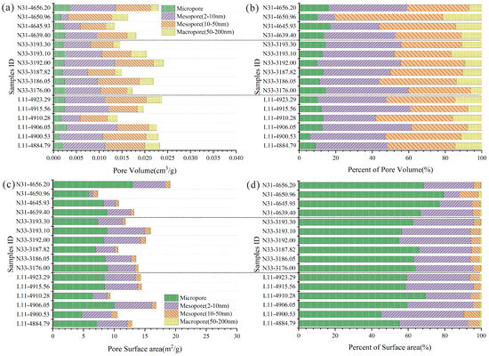 Percentage of PV distribution characteristics of micropores and meso-macropores in three wells (L11, N33, and N31). (a) Pore volume percentage distribution of the DBWD; (b) Pore volume percentage distribution of the DBSD; (c) Pore volume percentage distribution of the LBWD.