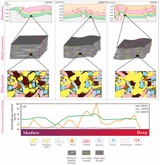However, the OM pore space can be deformed under different burial depths and tectonic deformation conditions. Some samples possess high TOC, but the OM is more plastic and prone to bending and deformation under external forces from DBSD examples. This result was shown in the SEM results of previous studies [22,23,37,39]. Compression and collapse of OM pores under compression conditions, resulting in a reduction in pore diameter, showing negative correlation and poor correlation characteristics (Figure 10a–c) [15,22]. Previous results show that most of the quartz was derived from biogenic silicon in the Longmaxi Formation and that the marine shelf environment, where large amounts of biogenic silicon and OM were deposited together, resulted in a significant positive correlation between TOC content and quartz content [58]. In this study, the relationship between quartz content and pore structure parameters was primarily positive in samples with weak tectonic deformation (Figure 10d–f), indicating that higher quartz content also shows higher TOC content, which promotes PV and SA development. In contrast, the relationship between quartz and TPV within the DBWD samples was insignificant and negatively correlated with the average pore diameter (Figure 10d–f). This phenomenon indicates that the strong tectonic compression and deformation have caused damage to the original correlation. Previous studies have shown that during mechanical compaction or deformation, clay minerals tend to form folds or bends [22,42]. During this process, pores with different diameters and shapes are associated, including high-angle faults or fractures perpendicular to the clay layer, most elongated and easily connected to microfractures [23,24,59]. In the present study, the relationship between clay content and pore structure parameters differed for various tectonic backgrounds (Figure 10g–i). The LBWD samples all show a positive correlation between clay mineral content and pore structure parameters. This phenomenon may be due to the shallow burial depth, which was subjected to appropriate compression stresses and formed a series of microfractures, resulting in a positive correlation. DBSD samples are subject to compression stress and burial depth; this correlation may not be significant (Figure 10g–i). In contrast to the two tectonic backgrounds, higher clay minerals are more prone to deformation at the deep burial, with compression and collapse of the pores within the clay minerals, resulting in a significant reduction in PV and SA under higher clay content [57].