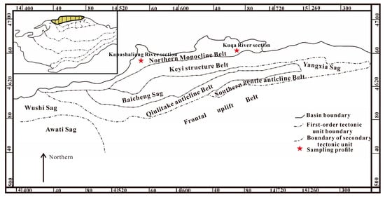 The Kuqa Depression is a secondary tectonic unit located in the northernmost part of the Tarim Basin. The north side is bounded by the Tianshan Piedmont fault zone, the south side is adjacent to the Tabei uplift, and the east and west sides are bordered by the Kurchu and Wushi sags [42] (Figure 1). Under the influence of the Tianshan Mountains and the Tabei uplift, the Kuqa Depression is elongated and gradually narrowed from southwest to northeast, with a total area of 2.6 × 104 km2. The seasonal rivers formed by melting of snow and water from the northern Tianshan Mountains carry sediments into the Kuqa Depression, and four stratigraphic sections of the Awat River, Kapushaliang River, Kelasu River, and Kuqa River are developed in the depression.