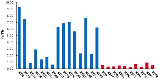 Isoprenoid alkanes include two types: regular and irregular. The regular type is mainly composed of a phytane series of compounds (≤C20) and high-carbon-number (>C20) regular isoprenoid alkanes, which are basically sources from the pigment of photosynthetic organisms, while the irregular type is mainly of a bacterial source. The distribution of the Pr/Ph values from the different sections of the Kuqa Depression is shown in Figure 2.