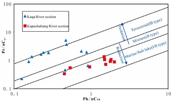 In addition to the Pr/Ph values, the Pr/nC17 and Ph/nC18 relationship diagrams also show that the oxidation–reduction properties of the source rock samples from the Kuqa River section and the Kapushaliang River section were completely different (Figure 3). Specifically, the samples of coal-bearing source rocks in the Kuqa River section were generally in an oxidizing sedimentary environment, while the samples of coal-bearing source rocks in the Kapushaliang section were in a reduced sedimentary environment. The macerals of the coal in the study area are all type III kerogen, which is a typical humic coal, indicating that the redox properties of the sedimentary environment of the two sections are obviously different.