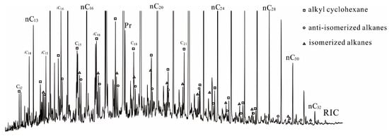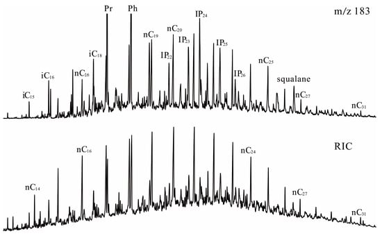 Through comparison, it was found that the regular isoprenoids of the Kuqa River section and the Kapushaliang River section in the Kuqa Depression had significant differences. In the Kapushaliang River section, we detected abundant regular high-carbon isoprenoid alkanes, mainly C21-C26 (IP21~IP26) compounds. The order of the chromatographic peaks of the related compounds is shown in Figure 4. There have been few studies on the number of regular high-carbon isoprenoid alkanes in the Kuqa Depression, Tarim Basin, but according to the reports in the literature, these compounds are all bacterial compounds [43,44]. The high-carbon regular isoprenoid alkanes in the study area were mainly distributed in the Kapushaliang River section with a low Pr/Ph ratio, indicating that these compounds formed in a strong reducing environment and likely contributed bacterial sources suitable for relatively high salinity environments.