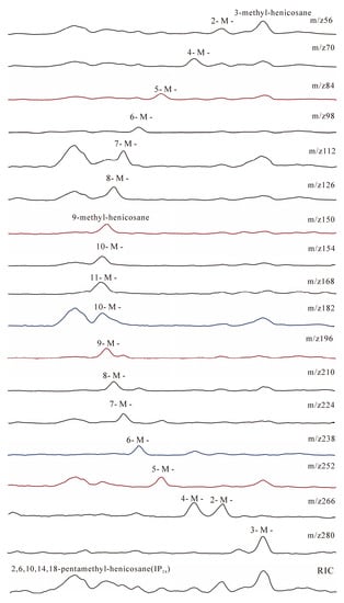 A complete series of monomethyl alkane compounds can be found at different degrees in the coal source rocks of the Kuqa Depression. Theoretically, the isomers of monomethyl chain alkanes with different carbon numbers can be detected in geological samples. As shown in Figure 5 and Figure 6, isomerized alkanes (2-methyl-) and anti-isomerized alkanes (3-methyl-) possess strong M-43 and M-29 fragments, 4-methyl-chain alkanes possess strong M-43 fragments, and 5-methyl possess strong M-57 fragments. The closer the methyl is to the middle of the alkane carbon chain, the farther forward the peak comes out (Figure 6).