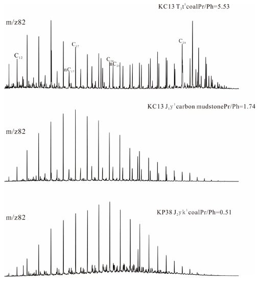 The characteristics of the carbon number of the alkyl cyclohexane series and n-alkanes in the coal measure source rocks of the Kuqa Depression were basically the same. Some samples maintained bimodal distribution characteristics as before (Figure 7) and were generally dominated by low-carbon compounds. The relative abundance of these compounds is obviously related to the sedimentary environment. It can be seen in Figure 7 that with a decrease in the Pr/Ph value, the abundance of the alkyl cyclohexane series compounds increased significantly with the decrease in n-alkanes in the m/z 82 mass chromatogram. The above characteristics may also indicate that the relative abundance of these compounds were mainly associated with the origin of the bacteria and algae.