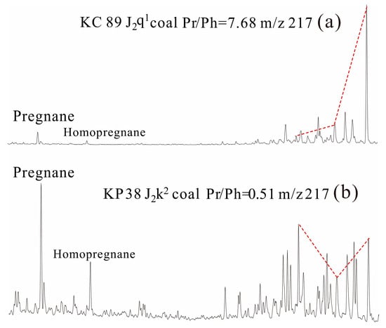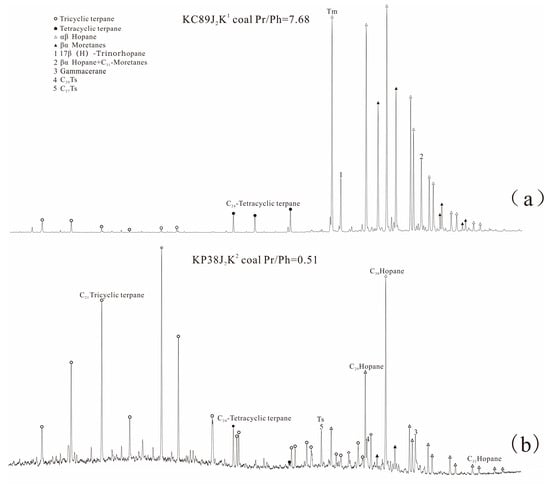 Studies have indicated that the Pr/Ph ratio is a good indicator of a source rock’s depositional environment, especially the redox properties. The Pr/Ph ratios of the Kuqa River section and the Kapushaliang River section in the Kuqa Depression were different, as shown in Table 2. Generally speaking, the Pr/Ph ratio of the humic coal in the Kuqa River section was higher than that of the Kapushaliang River section. The distribution range of the Pr/Ph ratio of the coal rock samples from the Kuqa River section was between 1.74 and 9.29, which is greater than 1, and the average value was 5.33. On the contrary, the Pr/Ph ratio of the coal rock samples from the Kapushaliang River section ranged from 0.25 to 0.91, all less than 1, with an average of 0.46. This phenomenon is rarely reported in the relevant literature, and the composition and distribution of other biomarkers in this type of coal also have obvious particularity.