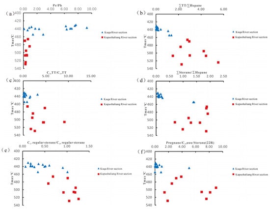 In addition to the parameters of the tricyclic terpane compounds, the ratio of ∑sterane/∑hopane and the ratios of the single sterane compounds, C27 regular sterane/C29 regular sterane and pregnane/C29αααsterane (20R), also showed similar regularity to the parameters of the tricyclic terpane compounds in the source rock samples from two different sections in the study area. The Tmax of the coal measure source rocks in the Kuqa River section varied slightly from 430 °C to 454 °C, and the ratios of ∑sterane/∑hopane and pregnane/C29αααsterane (20R) did not change significantly, but the ratio of C27 regular sterane/C29 regular sterane varied greatly, indicating that maturity was not the main factor influencing these parameters. The Tmax of the coal measure source rocks in the Kapushaliang River section varied greatly from 466 °C to 529 °C. The ∑sterane/∑hopane ratio, C27 regular sterane/C29 regular sterane ratio, and pregnane/C29αααsterane (20R) ratio had no obvious linear correlation with Tmax, and the results indicated that the variation in the sterane compounds in the coal measure source rocks in the research area was not controlled by the degree of the thermal evolution of the organic matter (Figure 10d–f).
