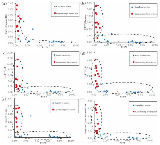 Figure 10a reveals the relationship between the Pr/Ph ratio and the maturity in the samples from the Kuqa River section and the Kapushaliang River section. The Tmax of the coal-bearing source rock samples from the Kuqa River section varied within a small range, from 430 °C to 454 °C, but the Pr/Ph ratio varied greatly. On the contrary, the maturity span of the coal measure source rock samples from the Kapushaliang River section was large, and the Tmax was between 466 °C and 529 °C, but the Pr/Ph ratio did not increase significantly with the increase in maturity; that is to say, there was no significant influence on the maturity or the Pr/Ph ratio of the source rock (Table 1).