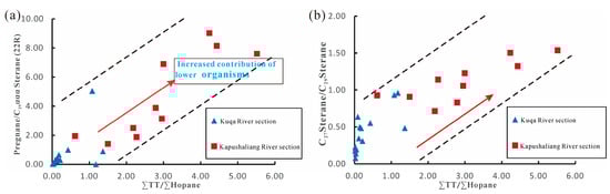 Sterane compounds are almost all derived from eukaryotes. It is commonly believed that C27 sterols and C27 steranes are abundant in aquatic organisms, whereas higher plants contain C29 steranes [63]. From Figure 12b it can also be seen that the total C27 sterane/total C29 sterane ratio was positively correlated with the ∑tricyclic terpane/∑hopane ratio. The total C27 sterane/total C29 sterane ratios of coal measure source rock samples from the Kuqa River section were less than 1.0, ranging from 0.08 to 0.96. The ratio of total C27 sterane/total C29 sterane in the coal measure source rocks from the Kapushaliang River section was greater than 1.0, which is between 1.06 and 1.54 (Table 2). Moreover, the C27 sterane/C29 sterane ratios of the coal measure source rock samples from the Kapushaliang River section were significantly higher than that in the Kuqa River section, indicating that the input of terrestrial organic matter from source rock in the Kuqa River section is much higher than that in the Kapushaliang River section, while the samples from the Kapushaliang River section are mainly bacteria or algae formed by the transformation of higher plants by microorganisms.