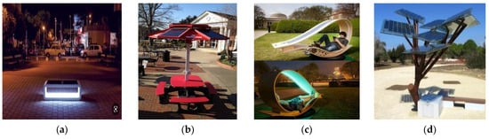- Premier, A.; GhaffarianHoseini, A.; GhaffarianHoseini, A. Solar-powered smart urban furniture: Preliminary investigation on limits and potentials of current designs. Smart Sustain. Built Environ. 2022, 11, 334–345. [Google Scholar] [CrossRef]
