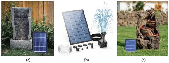 - Walmart. AISITIN 2.5 W Solar Fountain Pump, DIY Outdoor Solar Water Fountain Pump with 6 Nozzles and 4ft Water Pipe, Solar Powered Pump for Bird Bath, Ponds, Garden and Fish Tank Pond and Other Places—Walmart.com. Air Pumps. 2023. Available online: https://www.walmart.com/ip/AISITIN-2-5W-Solar-Fountain-Pump-DIY-Outdoor-Water-Pump-6-Nozzles-4ft-Pipe-Powered-Bird-Bath-Ponds-Garden-Fish-Tank-Pond-Other-Places/768326133 (accessed on 29 May 2023).