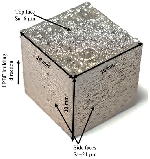 The LPBF technique was used to create an SS 316L component with a size of 10 × 10 × 10 mm3. Layer thicknesses (LTs) were varied across the four samples that were created. The SS 316L powder (Maher, Sheffield, UK) had spherical grains that ranged in size from 15 to 45 μm. Table 1 displays the elements that compose the 316L SS powder. The LPBF machine used was a Renishaw UK AM250 type from Gloucester, UK, which utilized a laser-pulsed beam with a power output of 200 W. The unit had a build volume capacity of 250 × 250 × 300 mm3 and a laser beam diameter of 70 × 5 μm. When performing LPBF, the scan approach employed was called “Meander”, and it involved a layer-by-layer rotation of 67 degrees in the scan direction [52]. The build platform was preheated to 170 °C, in accordance with the manufacturer-recommended standard build procedure, and all builds were fabricated under an Argon atmosphere with an oxygen level below 0.1%. The LPBF’s actual manufactured component is displayed in Figure 1. Table 2 contains the LPBF parameters that were chosen based on previous investigations [30,52]. To examine the effect of layer thickness alone on machining, the energy density was held constant by varying the exposure time in accordance with Equation (1):
