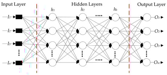 In general, the numerical values of these weights are determined through the iterative training of ANNs with the objective of minimizing the loss function that measures the difference between the predicted values and actual output values. Back propagation, a widely utilized method for weight optimization, implements the chain rule to iteratively compute gradients for each layer [60]. Following the completion of training, ANNs have the capability to generate outputs through utilizing the values of the hidden inputs. The structure of an ANN typically contains four important subcomponents, which are the number of “hidden layers”, the number of “neurons” in each layer, the “activation function”, and the “loss estimation function”. Figure 4 shows a visual representation of the ANN.