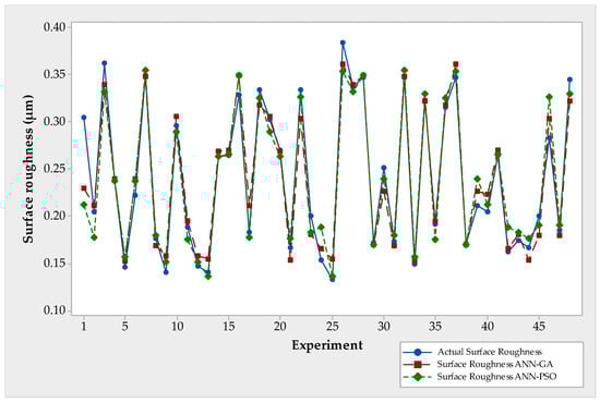 Based on the experimental data, it can be seen that the minimum surface roughness achieved was 0.133 μm. Further optimization techniques were applied, resulting in surface roughness values of 0.155 μm for the ANN-GA approach and 0.137 μm for the ANN-PSO. Consequently, both ANN-GA and ANN-PSO have improved surface quality, and they are more effective in this regard. Hence, the use of meta-heuristic algorithms optimizes the performance of the milling process parameters of an additively manufactured part. Finally, Figure 11 illustrates the improvement in surface quality of the components achieved through the implementation of optimization techniques.