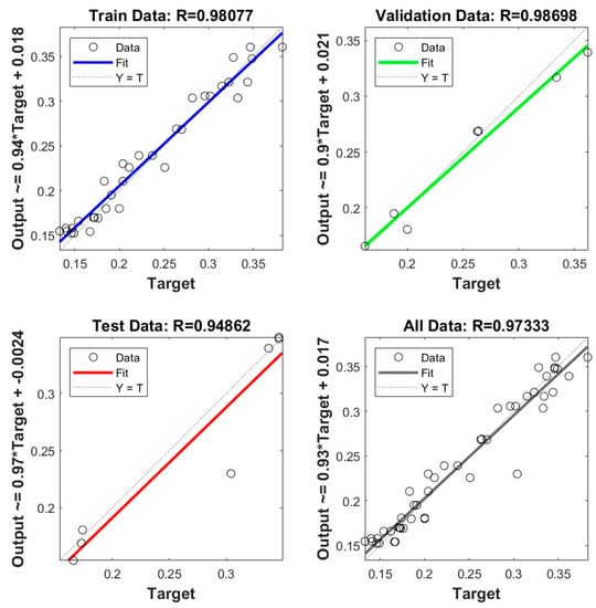 The network’s learning rate was set to values that generated the best correlation coefficient (R2) for the ANN. The constructed model’s fitness can also be expressed via the R2 value, which can be formulated as follows: