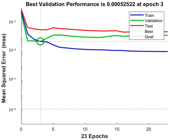 Figure 9 illustrates a regression analysis of the data, highlighting the linear coefficient of correlation (R) during the training, testing, and validation stages. Based on the results presented in Figure 9, it is obvious that the Levenberg–Marquardt algorithm yielded the highest R value (0.97333) when applied to the whole data. As a result, the ANN generated empty circles in contrast to the target values, while dashed lines represent the ideal linear approximation. The closeness of the fitted line to the midpoint shows that the neural network was able to estimate surface roughness values using different input process parameters in the milling process of an additively made component. Throughout the training process, the data achieved its highest level of optimization at the seventh iteration. At this point, the validation sample’s RMSE started to increase. Consequently, the training epochs were immediately terminated. This observation is depicted in Figure 10, which displays the plot of the RMSE. During epoch 3, the highest level of validation performance achieved was 5.2522 × 10−4.