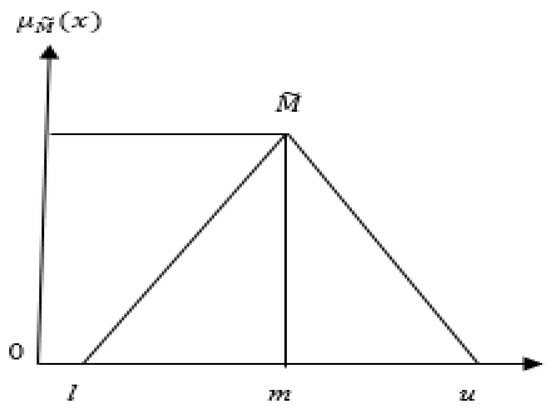 A fuzzy set in a universe of discourse X is characterized by membership function , which associates with each element x in X, a real number in the interval [0, 1]. The function is termed the grade of membership of x in M (see Equation (1) and Figure 1).