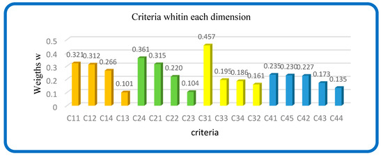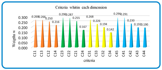 The comparison matrices, fuzzy matrices, and consistency evaluation are carried out using the procedure described earlier in the paragraph of Step 3. Subsequently, the extended method is employed to calculate the weights of the elements present in the matrices, as depicted in the supermatrix (refer to Figure 3). Following this, the determination of the weighted matrix ensues, followed by the acquisition of the limit supermatrix.