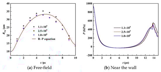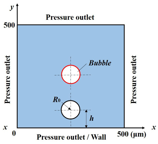 In this paper, the ANSYS-FLUENT software is used to simulate the bubble with the maximum radius of Rmax ≤ 50 μm. The calculation domain and initial conditions are shown in Figure 1. The square fluid domain with a side length of 500 × 500 μm is selected, and the quadrilateral structured grid is used to divide the whole calculation domain. The initial radius of the bubble in the calculation region is R0, the bubble in the free field is located at the center of the computational domain, and all boundaries are set to the pressure outlet. The bubble near the wall is located on the central axis of the calculation domain, and the distance between the center of the bubble and the wall is h. The lower boundary is set as a rigid boundary with no-slip boundary conditions on the wall, and the other boundaries are set as the pressure outlet. In order to capture the evolution of bubbles, transient simulation is enabled in the numerical simulation, and the convergence accuracy is 10−3. In the fluid micromass, the water phase is set as the main phase, and the bubble as the secondary phase, and the bubble particles are placed into the fluid micromass by Patch according to the requirements of subsequent simulation. In order to eliminate the influence of the number of grids on the calculation accuracy, the pulsation processes of bubbles in the free field and near the wall are numerically simulated, respectively. The bubble with an initial radius R0 = 10 μm is selected as the core, and the distance between the center of the bubble and the wall is 25 μm. The bubbles under the two field sources are initially in equilibrium in the liquid of 1 MPa, and then the environmental pressure suddenly drops to 0.1 MPa.