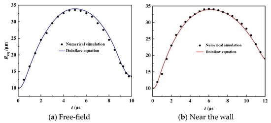 Based on the above-selected grid number and numerical simulation conditions, the fourth-order Runge–Kutta algorithm is used to solve Equation (9) by using Matlab software. The comparative analysis of the numerical simulation results of the variation of bubble radius with the analytical solution is shown in Figure 3. The results show that the calculation results of the two methods basically agree with each other, and the maximum relative error is 3%. This proves that the numerical method used in this study is reliable for the simulation of bubble collapse and also verifies the validity of the Doinikov equation.