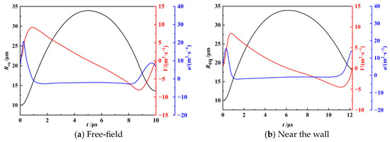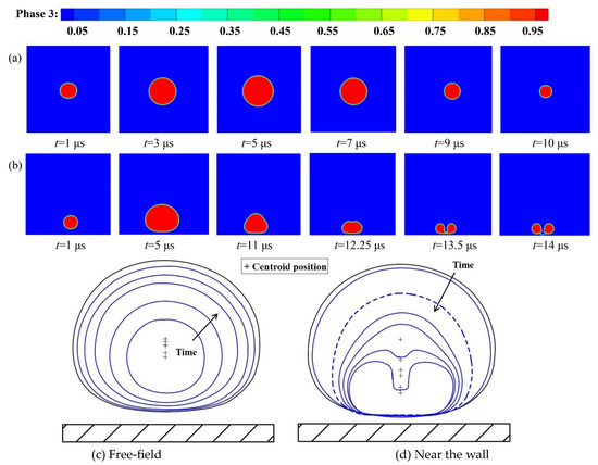 The shape of the bubble and the evolution of its center-of-mass positions in the free field and near the solid wall are shown in Figure 4a,b. Due to the symmetry of the system, the bubble shape in the free field is always regular spherical, and the center of mass of the bubble is fixed in position during the pulsation, while the bubble shape near the solid wall is non-spherical.