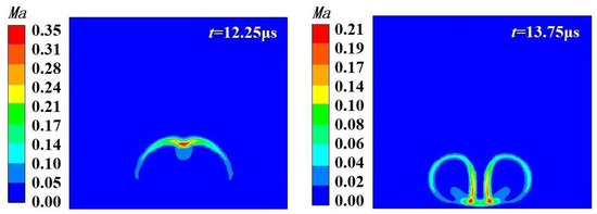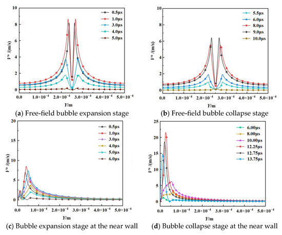 The velocity distribution of the flow field near the wall is different from the free field. As in Figure 11c,d, during the expansion phase, the flow velocity between the bubble and the wall gradually decreases as the spatial position of the bubble decreases, and the velocity of the flow field near the upper boundary of the bubble is not affected, and the velocity rises to 9 m/s at t = 1.0 μs, which is the same as the maximum flow field velocity of the free field at the time of expansion. During the collapse of the bubble, the velocity of the flow field at the top of the bubble increases significantly, and at t = 12.25 μs, the velocity of the surrounding flow field is 21.5 m/s, which is much larger than the velocity of the free field flow field.