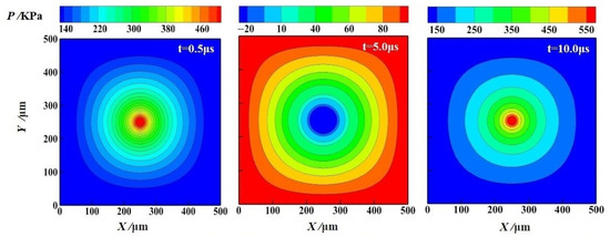 The pressure variation of the flow field around the bubble in the free field is shown in Figure 7. In the external flow field with Pamb = 0.1 MPa (reference pressure), the pressure inside the bubble releases and promotes the bubble surface to expand rapidly. When the pressure inside the bubble drops rapidly to the reference pressure, the bubble volume continues to increase under the effect of inertia, and the pressure inside the bubble drops to below the surrounding flow field pressure. When t = 5 μs, the bubble expands to its maximum volume, and the internal pressure of the bubble drops to a minimum of about 0.2 times the reference pressure. Then, the bubble begins to collapse, and the pressure inside and outside the bubble is the same again. Inertia causes the bubble to continue to contract to the minimum volume, and the internal pressure of the bubble rises sharply to 5.5 times the reference pressure.