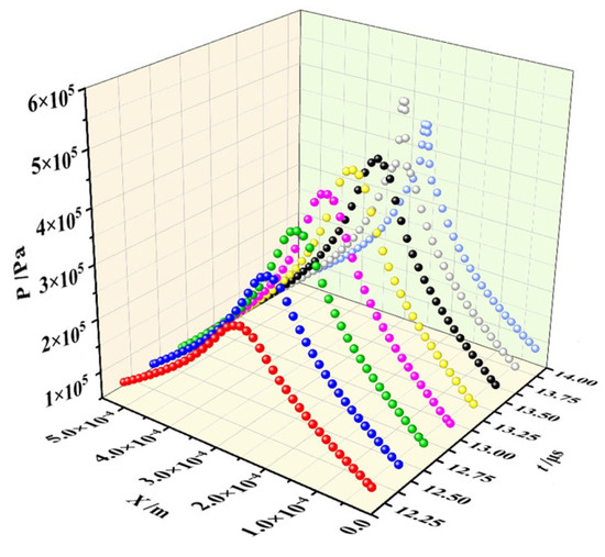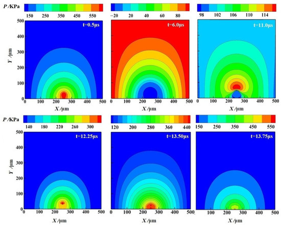 The flow field pressure distribution curves of the bubble expansion and collapse phases near the wall are shown in Figure 9c,d. The pressure inside the bubble is released rapidly during the bubble expansion process, and the pressure value of the flow field is greater than or equal to 0.1 MPa (reference pressure) in the range of t = 0~1.5 μs. Then, the bubble expands to the maximum volume and then contracts, and the pressure of the flow field around the bubble decreases at first and then increases. In the range of t = 2.0~11.0 μs, the overall pressure value of the flow field is less than or equal to 0.1 MPa. During the development phase of the jet (t = 12.25~13.75 s), the pressure of the flow field between the bubble and the wall gradually rises and produces large fluctuations.