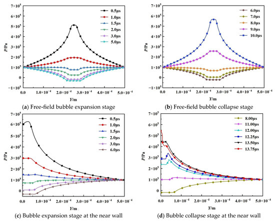 The flow field pressure distribution under different conditions is shown in Figure 9a–d, where Figure 9a,b shows the flow field pressure distribution curves of the bubble expansion and collapse stages in the free field, and the pressure distribution is symmetrically distributed along the central axis, where the horizontal value of the pressure line indicates the internal pressure of the bubble. The pressure inside the bubble is released rapidly during the bubble expansion, and the pressure value of the flow field is greater than or equal to 0.1 MPa in the range of t = 0~1.5 μs. Then, in the range of t = 2.0~8.0 μs, the bubble expands to the maximum volume and then contracts, and the pressure of the flow field around the bubble first decreases and then increases, and the pressure of the flow field is less than or equal to 0.1 MPa. At t = 9 μs, the bubble begins to collapse, resulting in a sharp increase in the pressure of the flow field around the bubble, which makes the pressure of the whole flow field larger than the reference pressure again.
