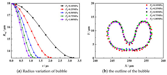 Under the conditions of dimensionless distance γ = 1.1 and initial radius Req = 18 μm, the changes in bubble shape, jet velocity, and wall impact load are studied when the driving pressure Pd is between 0.1 to 1 MPa. Figure 12a,b shows the variation of the radius and profile of the bubble when the bubble collapses under different driving pressure Pd, respectively. The results show that the time for the bubble to collapse to the minimum radius is 3.2 μs when Pd = 0.1 MPa, while the bubble collapse time to the minimum radius is 1 μs at Pd = 1 MPa. With the increase in driving pressure, the bubble collapse velocity increases, and the collapse period decreases. Moreover, at γ = 1.1, the bubble profiles are the same for different driving pressures Pd acting on the bubble collapse, and the equivalent radius Req is 13.4 μm, which is consistent with the phenomenon observed by Hasio [28]. This shows that changing the initial driving pressure does not affect the shape of the end of the bubble collapse under the same γ condition.