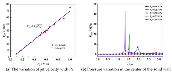 Figure 13a shows the influence of the change in driving pressure on the jet velocity. The red point is the jet velocity when the bubble collapses. When Pd = 0.1 MPa, the maximum jet velocity is 5 m/s, while when Pd = 1 MPa, the maximum jet velocity is 75 m/s. With the increase in driving pressure, the jet velocity increases gradually. The maximum jet velocity at this scale is in the same order of magnitude as the experimental measurements of Brujan [29]. The correlation between different driving pressure values in the range of 0.1 to 1 MPa and the maximum jet velocity is studied. The results show that the jet velocity increases with the increase in the square root of the driving pressure Pd. In this case, the jet velocity can be approximately as follows: