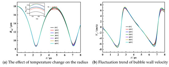 Figure 15 shows the bubble radius and bubble wall velocity at different temperatures. The influence of different temperatures on the bubble radius is shown in Figure 15a. With the increase in temperature, the radius of the bubble decreases when it collapses and increases when it rebounds. When the liquid temperature is 0, 10, 20, 30, 40, 50, and 60 °C, the maximum radius of bubble rebound is 17.48, 17.65, 17.67, 17.68, 17.84, and 17.85 μm, respectively. Figure 15b shows the bubble wall velocity at different temperatures. With the increase in liquid temperature, the bubble wall velocity increases slightly, mainly because the increase in liquid temperature increases the motion of gas molecules, which in turn aggravates the collapse velocity of the bubble wall.