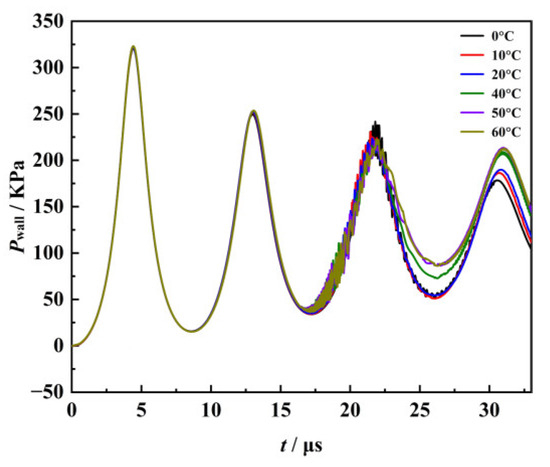The pressures at the center of the bubble action wall at different temperatures are shown in Figure 16. It can be seen from the figure that the increase in temperature does not have a significant effect on the first pulsating pressure amplitude generated at the wall of bubble collapse action. When the bubble passes through several pulsating cycles, the change in liquid surface tension and viscosity caused by the change in liquid temperature has a significant effect on the bubble. When the liquid temperature is 0 °C (t = 30.6 μs), the bubble collapse impact pressure on the wall is 178 KPa, while when the liquid temperature is 60 °C (t = 31 μs), the pulse pressure on the wall is 213 KPa. With the increase in the liquid temperature, the pulse pressure on the wall increases, which is mainly due to the decrease in the liquid viscosity and the increase in the phase transition rate on the bubble surface and the bubble shrinks sharply and produces a high-speed jet, which forms a higher impact pressure on the wall.