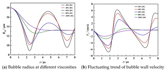 Figure 17 shows the bubble radius and bubble wall velocity under different liquid viscosity. The change in bubble radius under different liquid viscosity conditions is shown in Figure 17a. It can be seen from the figure that liquid viscosity has a significant effect on the minimum shrinkage radius of bubbles. In 20%, 40%, 60%, 80%, and 100% DG solutions, its radius is 8.91, 10.11, 10.44, 12.59, and 13.19 μm, respectively. With the increase in liquid viscosity, the minimum radius of bubble contraction increases. Figure 17b shows the bubble wall velocity at different liquid viscosities. In a 20% DG solution, the bubble wall velocity is 7 m/s, while in a 100% DG solution, the bubble wall velocity is 2 m/s. With the increase in liquid viscosity, the collapse rate of the bubble wall decreases, and the time required for the bubble to contract to the minimum volume is prolonged. Overall, a more viscous liquid decreases the collapse rate of the bubble walls and increases the minimum shrinkage volume of the bubbles.
