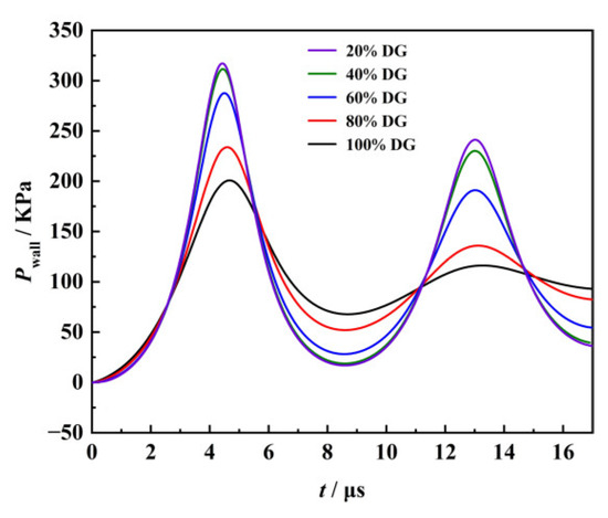 The pressure variation at the center of the solid wall during the collapse of bubbles in different viscous solutions at γ = 1.5 and the driving pressure Pd = 0.1 MPa is shown in Figure 18. As the γ is small, the first collapse of the bubble has the greatest impact on the wall. Therefore, this paper will only discuss the effect of the first bubble collapse. In 20%, 40%, 60%, 80%, and 100% DG solutions, the maximum pressure values of the first bubble collapse wall Pmax are 317.74, 312.08, 288.31, 233.87, and 200.71 KPa, respectively. With the increase in liquid viscosity, the pressure of bubble collapse impact wall decreases in varying degrees. In addition, the time t for bubble collapse to impact the wall is 4.45, 4.48, 4.51, 4.64, and 4.72 μs in 20%, 40%, 60%, 80%, and 100% DG solutions, respectively, indicating that the greater the viscosity of the liquid, the longer the period for bubble collapse to impact the wall.