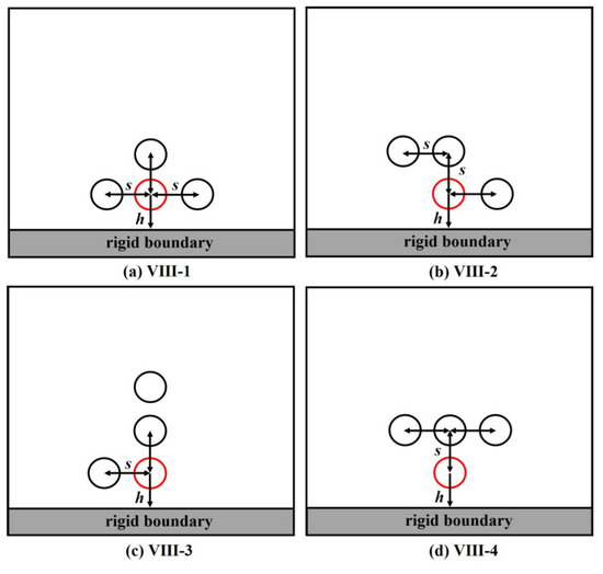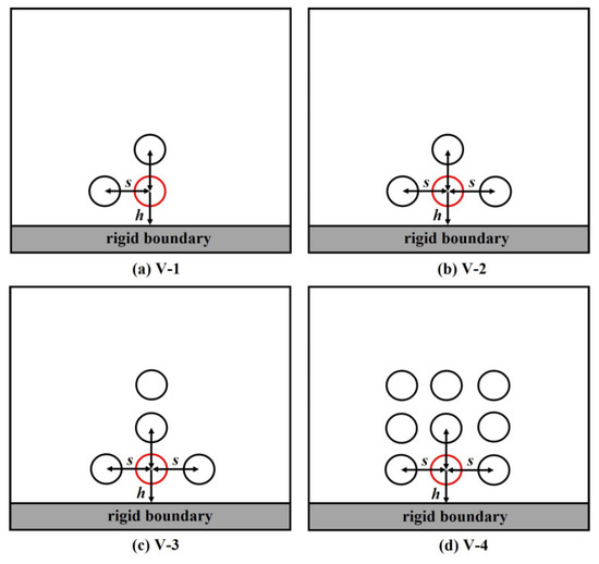 In Section 3.4, it is found that the asymmetry of bubble distribution has a significant influence on the flow field and bubble dynamics. In order to clarify the influence of multi-bubble arrangement on bubble collapse, four different bubble distribution conditions are set under the same number of bubbles. As shown in Figure 25, the adjacent bubbles are arranged on a horizontal or vertical wall. The distance between bubbles S and the distance between bubble center and wall h are set to 2 Rmax (Rmax = 18 μm).