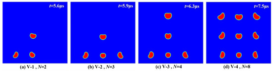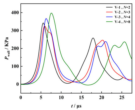 It can be seen from the figure that the bubble collapse undergoes the stratification phenomenon, collapsing from top to bottom step by step, and the volume of the bubble collapsing decreases step by step, with the bubble near the center of the wall having the smallest volume. When N = 2, 3, 4, and 8 bubbles are placed near the center of the wall, the time t for the bubble collapse to form a pressure pulse on the wall for the first time is 5.6, 5.9, 6.3, and 7.5 μs, respectively. With the increase in the number of surrounding bubbles, the bubble collapse period near the center of the wall is prolonged.