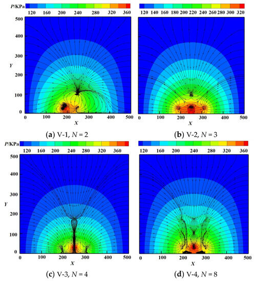 Flow field pressure and velocity streamlines in the presence of an unequal number of surrounding bubbles (N = 2, N = 3, N = 4, N = 8).
