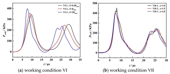 The pulse pressure applied on the wall in the bubble cluster is analyzed. As shown in Figure 24, the wall impact pressure is affected by bubble-wall distance and bubble-bubble distance. Under condition VI, the pulse pressure of the bubble cluster collapse on the wall increases with the increase in bubble spacing. When S = 2 Rmax, the maximum pressure acting on the wall is 400 KPa. In working condition Ⅶ, the pressure acting on the wall increases as γ decreases, and the maximum pulse pressure formed is 450 KPa when the bubble cluster is very close to the solid wall. By comparing working condition VI and working condition VII, it is found that reducing the bubble-wall distance and increasing the bubble-bubble spacing can enhance the pulse pressure on the wall by bubble cluster collapse, and the bubble-wall distance plays a more important role in forming a larger surface pulse pressure. In addition, the change in bubble spacing also has a significant effect on the energy release of bubble cluster. In engineering, changing the distance between bubbles (for example, reasonably adjusting the distance between bubbles through external acoustic interference or increasing the bubble spacing by reducing the bubble size) can also effectively control the pulse pressure of the bubble to the wall.