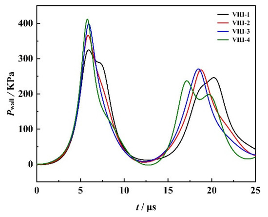 The pulse pressure of the bubble collapse on the center of the wall under different bubble distributions is shown in Figure 27. The more bubbles concentrated in the upper part of the central bubble (such as Ⅷ-4), the greater the pressure on the bubble collapse wall, and the value of the pressure depends on the upper bubble arrangement, such as Ⅷ-2 and Ⅷ-3. When the number of bubbles in the upper part of the central bubble is the same, the pressure values of horizontal arrangement and vertical arrangement are 360 and 400 KPa, respectively. The principle of action follows the double bubble criterion, i.e., vertical arrangement of bubbles can enhance the pressure acting on the wall and the collapse of surrounding bubbles.