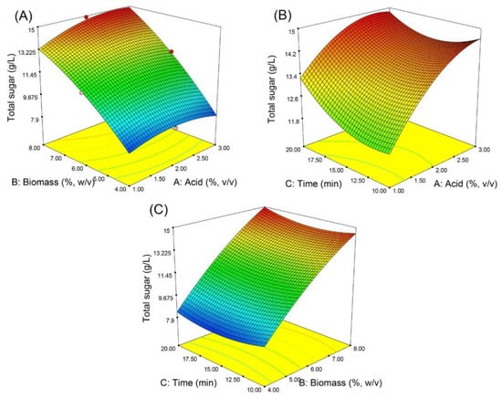 Three-dimensional surface plots were generated to visualize the interaction effects between the variables tested on total sugar production.Figure 1A shows that the total sugar production was highly dependent on the acid concentration and biomass loading. Increasing the acid concentration and biomass loading increased the total sugar production, as more substrate and catalyst were available for the hydrolysis reaction [18]. However, using too high of an acid concentration could have led to higher degrees of sugar degradation [39], leading to a low sugar yield and the formation of microbial inhibitors [13]. This phenomenon was recently reported by Soliman et al. [40]; the use of sulfuric acid at higher than 3% led to decreased reducing sugar production from macroalgal biomasses (Sargassum latifolium and U. lactuca). On the other hand, increasing the biomass loading beyond a certain level could result in increased medium viscosity, which, in turn, impedes mass and heat transfers during the process, leading to a low hydrolysis yield [41]. This effect has been reported in several studies, including that by Harchi et al. (2018) [16], in which increasing the U. rigiga biomass loading from 10% to 15% led to lower sugar yields.
