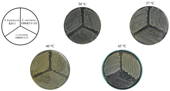 The growth performance of S. cerevisiae DBKKU Y-53, K. marxianus DBKKU Y-102, and P. kudriazevii RZ8-1 on YM agar at different incubation temperatures (30 °C, 37 °C, 40 °C, and 45 °C) are shown in Figure 3. All the thermotolerant yeasts grew well at temperatures up to 40 °C. However, only K. marxianus DBKKU Y-102 and P. kudriazevii RZ8-1 could thrive at 45 °C, while S. cerevisiae DBKKU Y-53 showed obviously low growth. This finding was in agreement with other studies. For instance, Sree et al. [54] investigated the growth of S. cerevisiae isolated from soil at a thermal power plant in India and demonstrated that all the yeasts grew well below 40 °C, and only two strains were able to grow at 44 °C in a liquid medium but not on a solid medium. Edgardo et al. [55] reported that 11 strains of thermostable S. cerevisiae could grow at 35 °C and 40 °C; however, none of these grew at 45 °C. On the other hand, a study by Techaparin et al. [29] showed that P. kudriazevii KKU-TH43 and KKU-TH33 isolated from soil samples could grow at a high temperature of 45 °C. Likewise, Pongcharoen et al. [56] demonstrated that P. kudriazevii NUNS-4, NUN-5, and NUNS-6 isolated from soil in sugarcane plantation areas in Thailand could grow at a high temperature up to 45 °C. A study by Banat et al. [57] reported that K. marxianus was able to grow at temperatures as high as 52 °C.