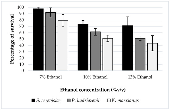 The ability of the yeast strains to tolerate ethanol, as a component in the fermentation medium, in the range 7 to 13% (v/v) at 35 °C is shown in Figure 4. The ability to tolerate ethanol was divided into three categories: highly tolerant (more than 50% of cells survived), moderately tolerant (25–50% of cells survived), and slightly tolerant (less than 25% of cells survived) [58]. As shown in the figure, all yeasts tested were highly tolerant to ethanol with up to 10% (v/v). Further increasing the ethanol concentration to 13% led to a further reduction in cell survival. However, S. cerevisiae DBKKU Y-53 and P. kudriazevii RZ8-1 were still highly tolerant, while the survival of K. marxianus DBKKU Y-102 dropped below 50%, so it was considered moderately tolerant to ethanol at 13% at 35 °C. Overall, S. cerevisiae DBKKU Y-53 exhibited the best performance in ethanol tolerance, followed by P. kudriazevii RZ8-1 and K. marxianus DBKKU Y-102, respectively. The present results agreed well with other studies, such as that of Luong [59], who reported an ability of S. cerevisiae to tolerate high ethanol concentrations in the range 115 to 200 g/L, and Kumar et al. [60], who reported the ethanol tolerance of Kluyveromyces sp. IIPE453 (MTCC 5314) at 82 g/L. Similarly, a study by Techaparin et al. [29] demonstrated that S. cerevisiae KKU-TH33, KKU-TH43, KKU-TH200, and KKU-TH200 and P. kudriazevii KKU-VN35 exhibited a high ethanol-tolerant ability at 13% (v/v) ethanol with over 50% cell survival. Studies by Ndubuisi et al. [61] and Pongcharoen et al. [56] also demonstrated that P. kudriazevii LC375240 and P. kudriazevii NUPHS33 and NUPHS34 were able to grow in YPD containing an ethanol concentration of 15% (v/v). The ability of yeast strains to withstand different stresses depends on several factors, including the yeast species, genetic background, and culture conditions. For instance, P. kudriavzevii exhibited higher thermal tolerance than S. cerevisiae [32]. The ability of the yeast cells to withstand ethanol stress might be associated with the expression of genes involved in heat-shock protein synthesis, ATP production, trehalose, and glycogen production [28]. As demonstrated by Phong et al. [62], the overexpression of the ATP6, OLE1, and ERG8 genes improved the growth and ethanol production of S. cerevisiae HG1.1 under heat and ethanol stresses. Further study is needed to clarify this phenomenon.