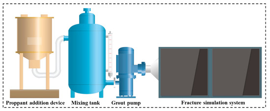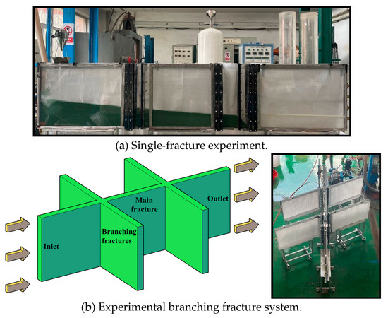 When proppants are injected through a main fracture into a complex fracture network, flow diversion occurs as the proppants pass through branched fractures, affecting the proppant transport process. However, alterations in the proppant particle size and injection rate induce changes in the forces exerted on the proppant particles within the fracturing fluid, thus influencing their transport and distribution. We investigated the influence of the proppant particle size and injection rate on proppant transport under single-fracture and branched-fracture conditions, as listed in Table 1. The selected experimental proppants consisted of quartz sand with sizes of 270–550 μm (30–50 mesh), 212–380 μm (40–70 mesh), and 109–212 μm (70–140 mesh). Proppants of various mesh sizes were dyed to facilitate the observation of their transport patterns. Slickwater with a viscosity of 5 mPa·s was used as the fracturing fluid and a constant sand ratio of 20% was maintained.
