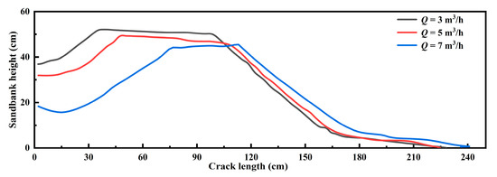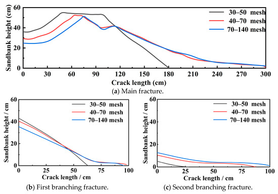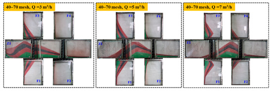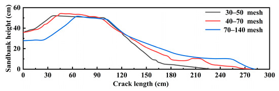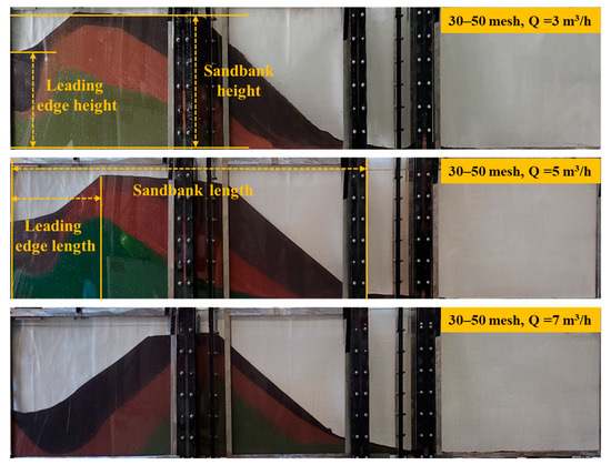 The particle size profoundly influences the transport and arrangement of proppant particles. The arrangement characteristics of proppants varying in particle sizes were derived under injection rates of 3.0, 5.0, and 7.0 m3/h, as depicted in Figure 6. At an injection rate of 3.0 m3/h and with proppant particle sizes of 109–212 μm (70–140 mesh), the leading edge of the sandbank had a height of 27.7 cm and a length of 51.0 cm, whereas the equilibrium height and length were 51.6 and 282 cm, respectively. For the proppant particle sizes of 212–380 μm (40–70 mesh), the leading edge of the sandbank had a height and length of 35.8 cm, respectively, with an equilibrium height and length of 54.2 and 276 cm, respectively. For the proppant particle sizes of 212–380 μm (40–70 mesh), the leading edge height and length of the sandbank were both 35.8 cm, and the equilibrium height and length of the sandbank were 54.2 and 276 cm, respectively. As the proppant particle size increased, the gravitational force increased the vertical force on the proppant, resulting in an increased settling rate. Proppant particles rapidly settled and accumulated at the fracture near the wellbore, forming a sandbank. The fracturing fluid consistently introduced a proppant into the fracture, leading to an accumulation at the leading edge of the sandbank until an equilibrium state was reached. Thus, as the particle size increased, and the height of the leading edge of the sandbank increased, whereas the length of the sandbank decreased. Therefore, with increasing particle sizes, the leading edge of the sandbank experienced an elevated height coupled with a reduced length.