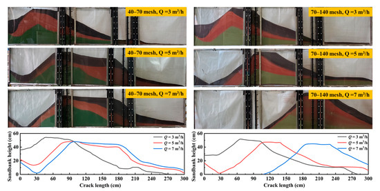 Sandbank morphology at different injection rates (particle size: 40–70 and 70–140 mesh).